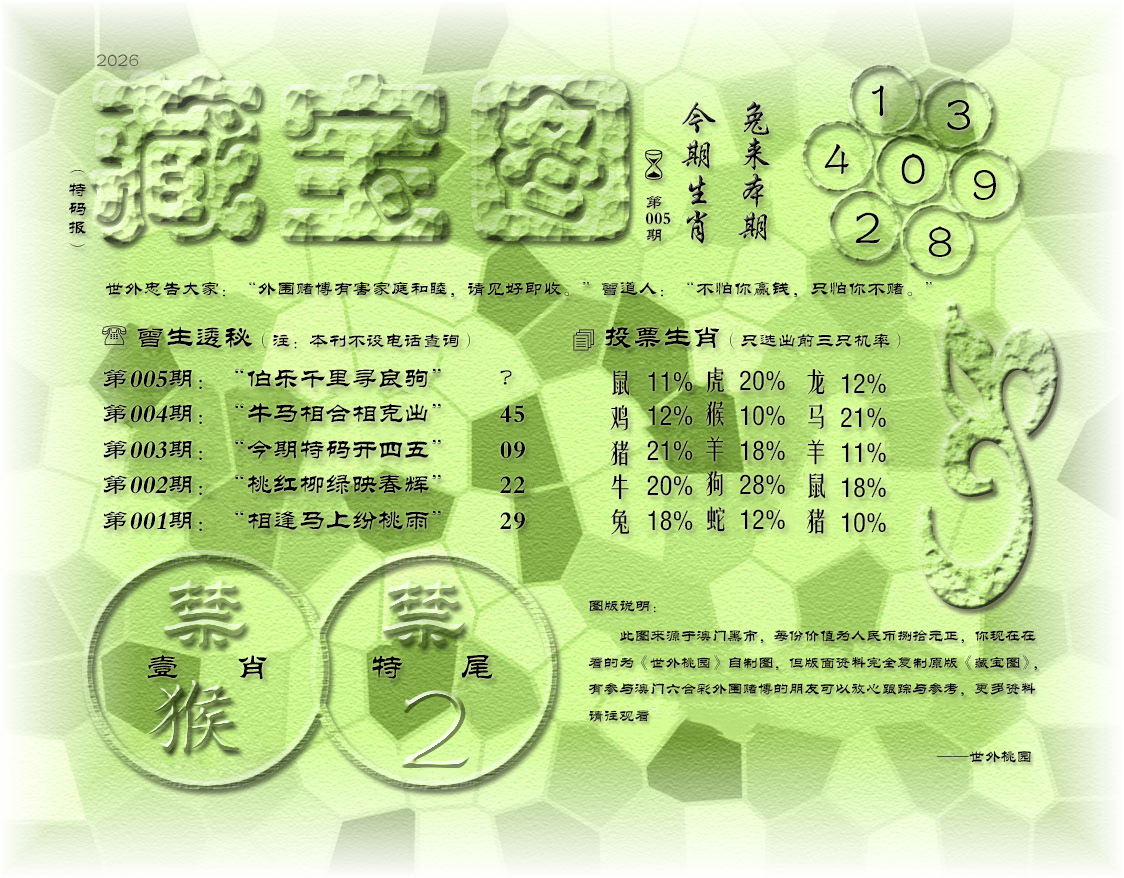 005期推荐六肖:猴蛇虎鸡牛狗 005期推荐四肖:猴蛇虎鸡 005期推荐三肖:猴蛇虎 005期十码:10 46 01 49 04 28 33 45 05 29 005期五码:10 46 01 49 04 请大家记住网址:626993.COM